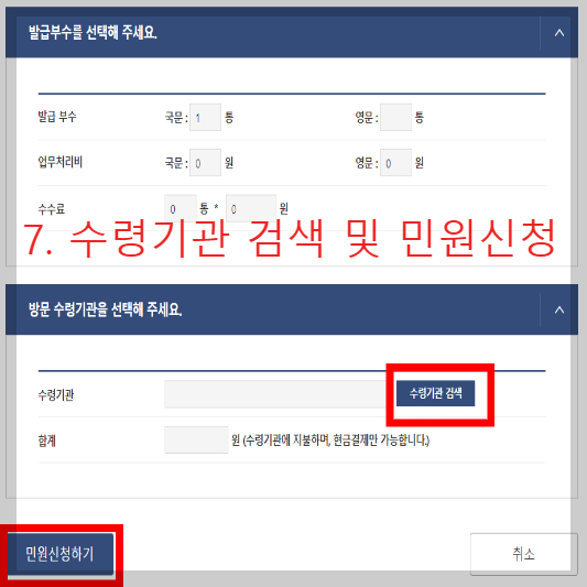 ☞ 국문 or 영문과 몇 통을 수령할지 선택을 하고 수령기관을 검색해 민원신청을 합니다.