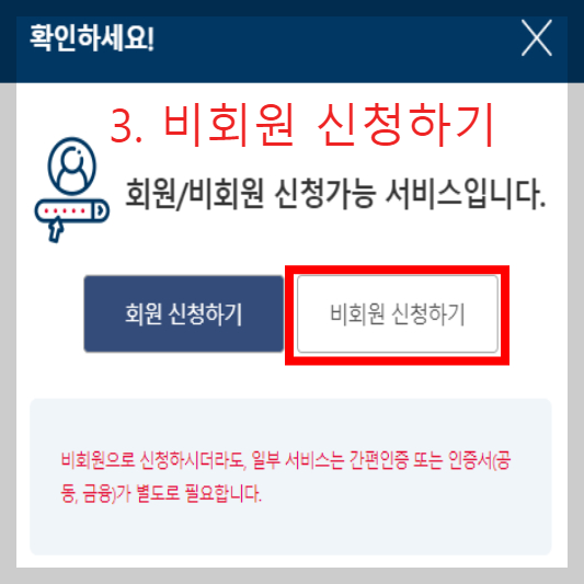 ☞ 회원 or 비회원신청하기가 있는데 회원가입이 안되어있으면 비회원 신청하기를 누릅니다.
