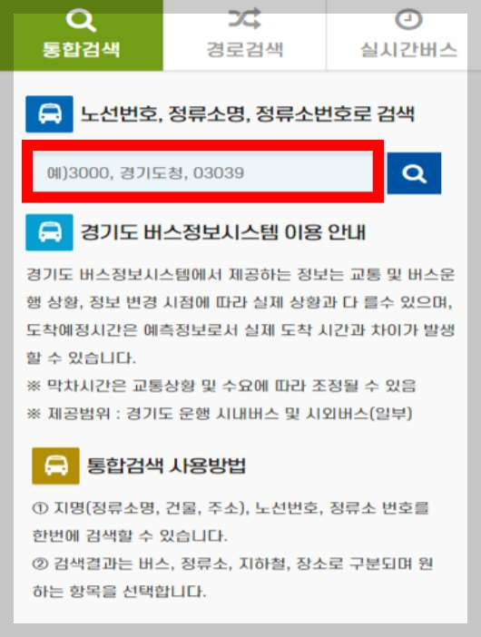 경기버스 정보 사이트로 접속하여 들어가면 메인 화면에 통합검색할 수 있는 화면이 나옵니다.