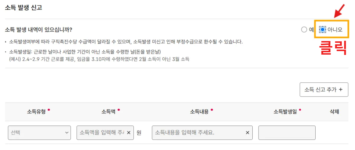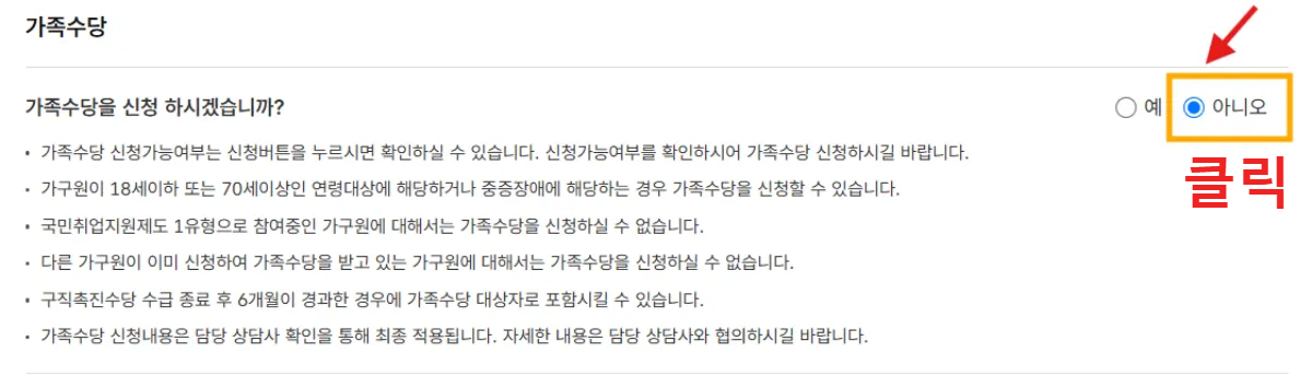 소득 발생, 취업, 가족 수당 여부 확인 후 체크