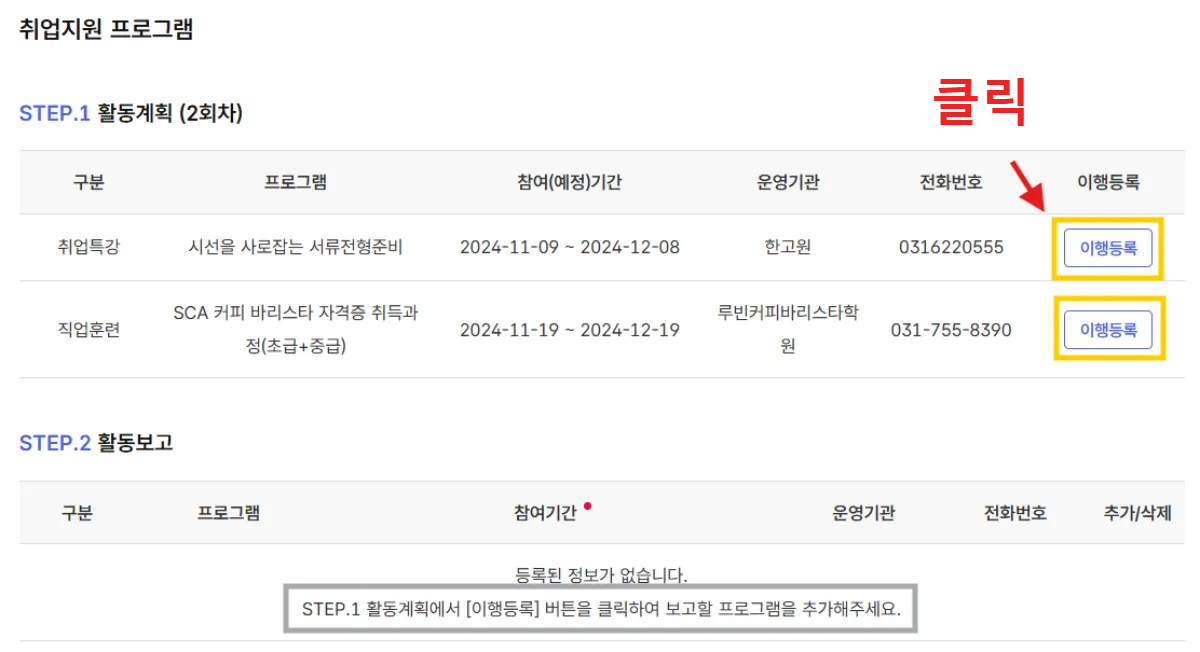 (하단) STEP.1 활동계획 (2회 차)에 자동으로 참여한 프로그램이 뜹니다.