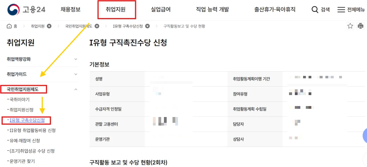 - (상단메뉴) 취업지원 → 국민취업지원제도 → 1 유형 구촉수당신청 순으로 들어간다.