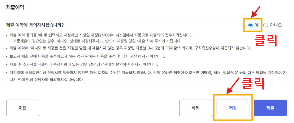 - 제출예약에 동의하고 저장버튼을 누른다.