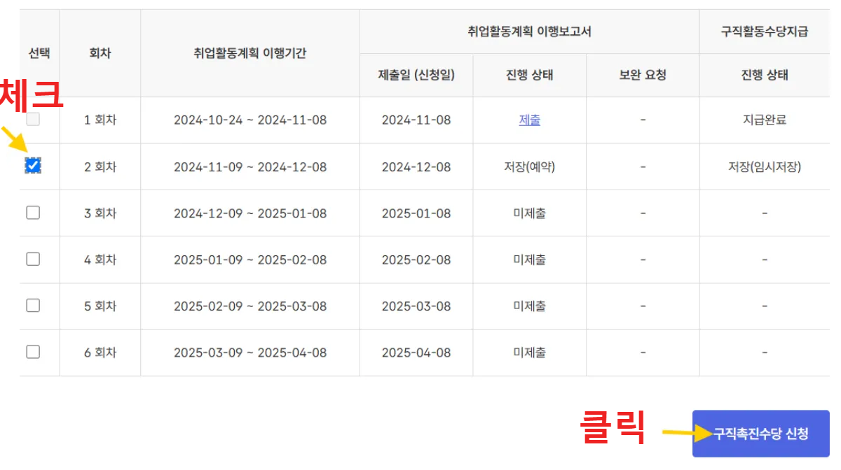 (하단) 해당 회차(2회 차)에 체크하고 구직촉진수당 신청을 클릭