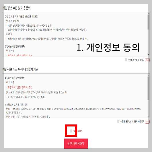 1. 개인정보 동의란에 전체 체크를 하고 신청서 작성하기를 클릭합니다.