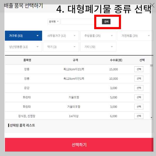 4. 다음으로 대형폐기물의 종류를 선택합니다. 대형폐기물마다 처리 수수료가 다르니 정확히 선택하는 것이 좋습니다.
