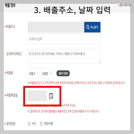 3. 대형폐기물을 배출할 주소와 상세위치를 적습니다. 아파트의 경우 0동 분리수거장, 주택의 경우 00번지 대문 앞 이렇게 적습니다. 그리고 배출예정일과 결제방법을 선택합니다.